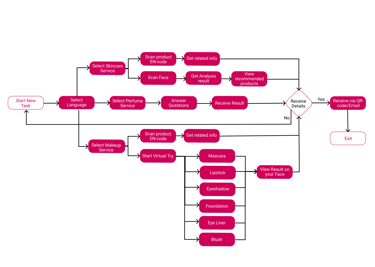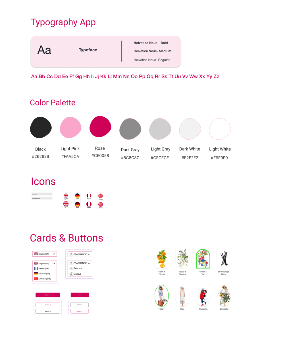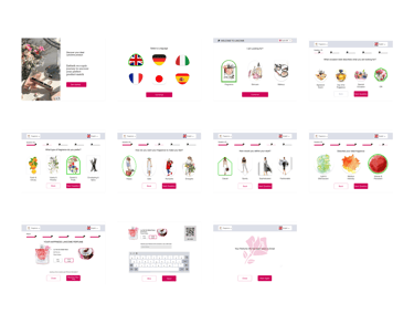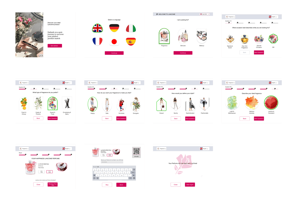 Below are selected screens from the high-fidelity prototype, designed to guide travelers through a seamless self-service shopping experience at the Lancôme retail store