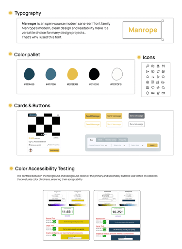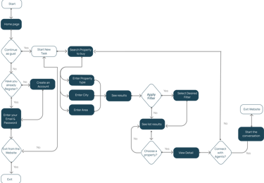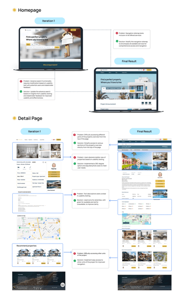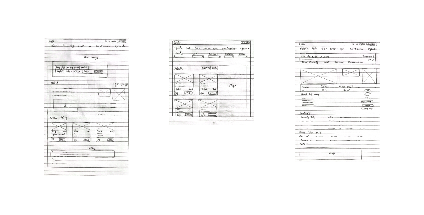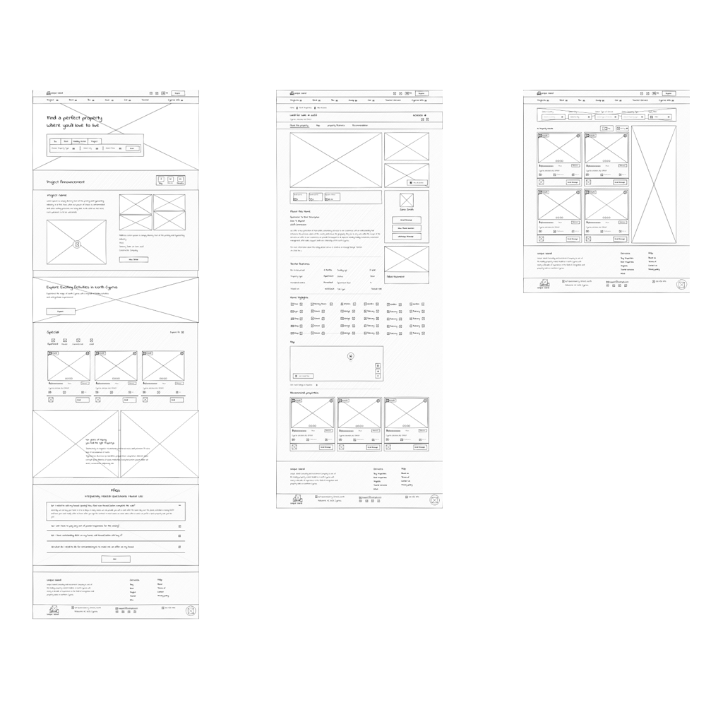 We started with low-fidelity sketches to quickly explore layout ideas and test different ways of organizing information. These evolved into wireframes that helped us validate structure, hierarchy, and content flow, especially on key pages like property listings and service overviews