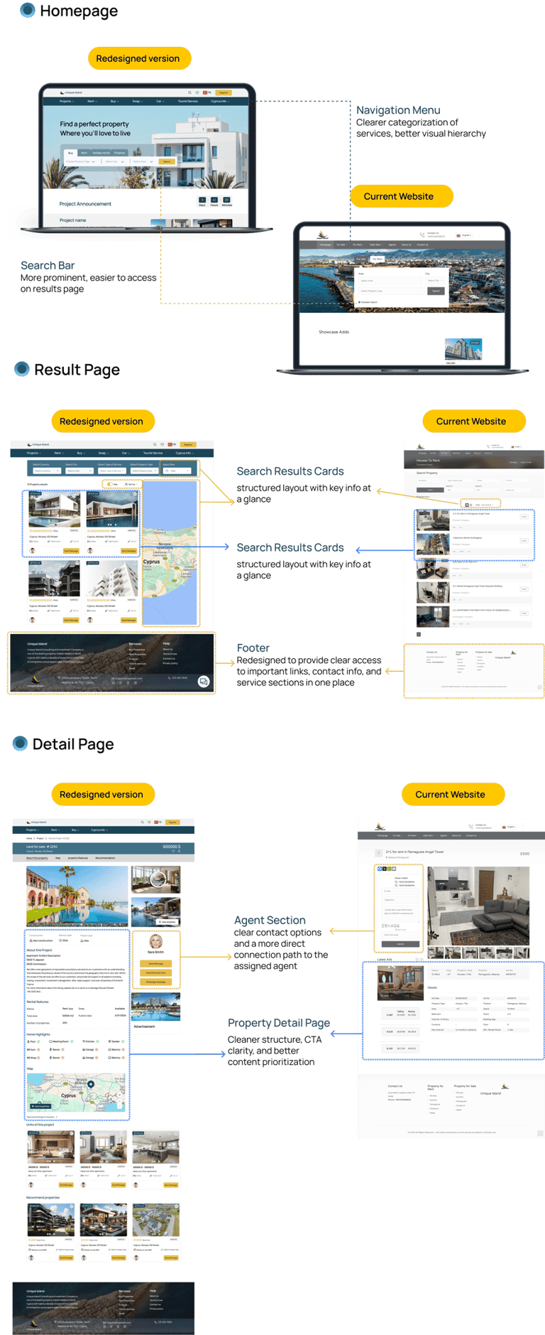 We’re redesigning the platform to bring together real estate listings, car rentals, student housing, and tourism services, all in one place. The goal is to simplify the experience for people moving to or visiting Cyprus by creating a clearer, more trustworthy, and easier-to-navigate website. Instead of switching between messages, platforms, or unclear listings, users can now explore services, compare options, and find what they need, all in a single, cohesive space